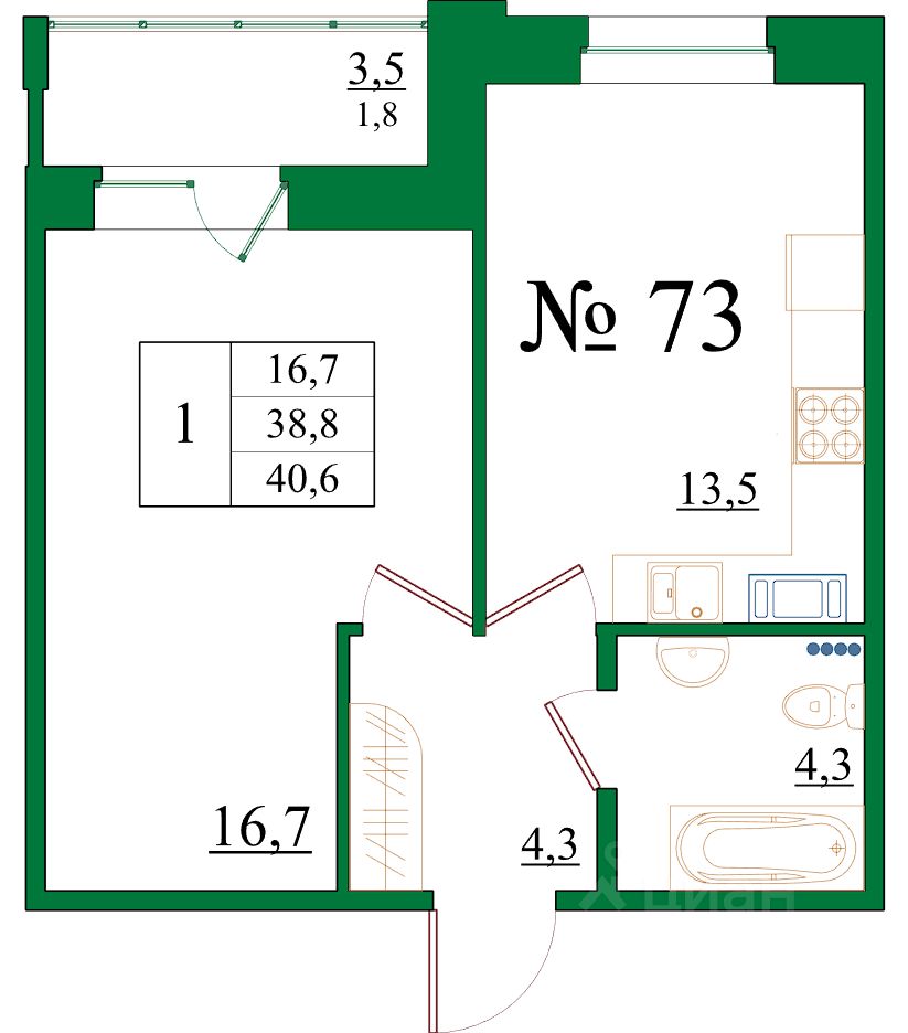 Продаётся 1-комнатная квартира в сданном доме (Корпус 1), срок сдачи: IV-кв. 2024, общей площадью 40.6 кв.м., на 6 этаже.