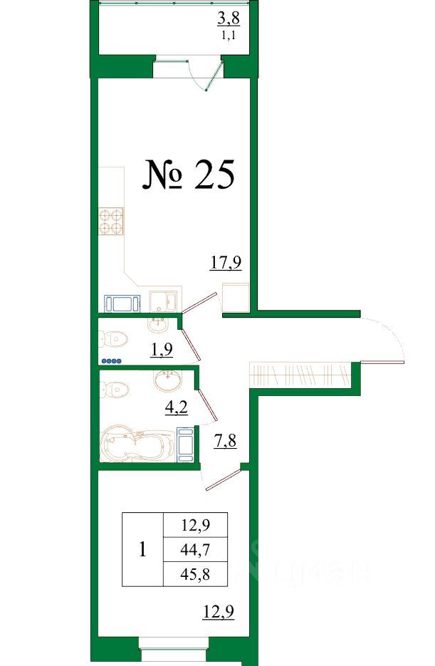 Продаётся 1-комнатная квартира в сданном доме (Корпус 5), срок сдачи: III-кв. 2025, общей площадью 45.8 кв.м., на 4 этаже.