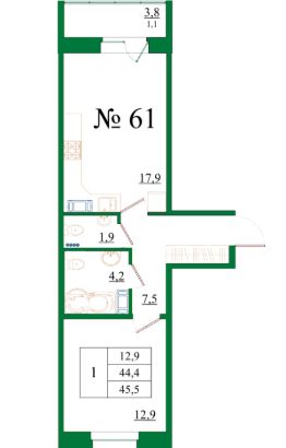 Продаётся 1-комнатная квартира в сданном доме (Корпус 5), срок сдачи: III-кв. 2025, общей площадью 45.5 кв.м., на 8 этаже.
