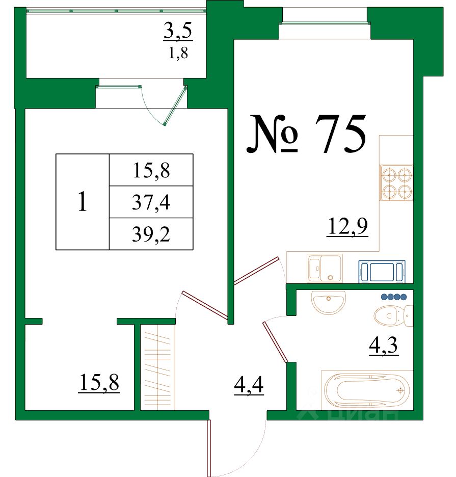 Продаётся 1-комнатная квартира в сданном доме (Корпус 5), срок сдачи: III-кв. 2025, общей площадью 39.2 кв.м., на 5 этаже.