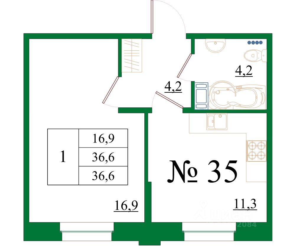 Продаётся 1-комнатная квартира в строящемся доме (Корпус 6), срок сдачи: IV-кв. 2025, общей площадью 36.6 кв.м., на 1 этаже.