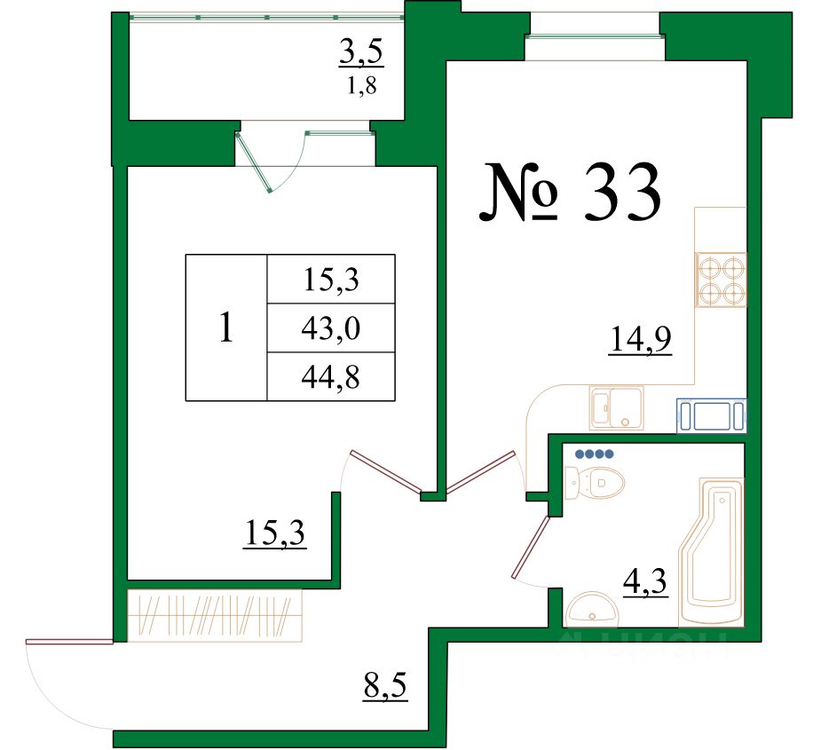 Продаётся 1-комнатная квартира в строящемся доме (Корпус 6), срок сдачи: IV-кв. 2025, общей площадью 44.8 кв.м., на 5 этаже.