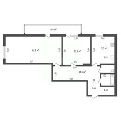 Комнаты: 2 изолированные (гостиная 22 м² + спальня 12 м²)