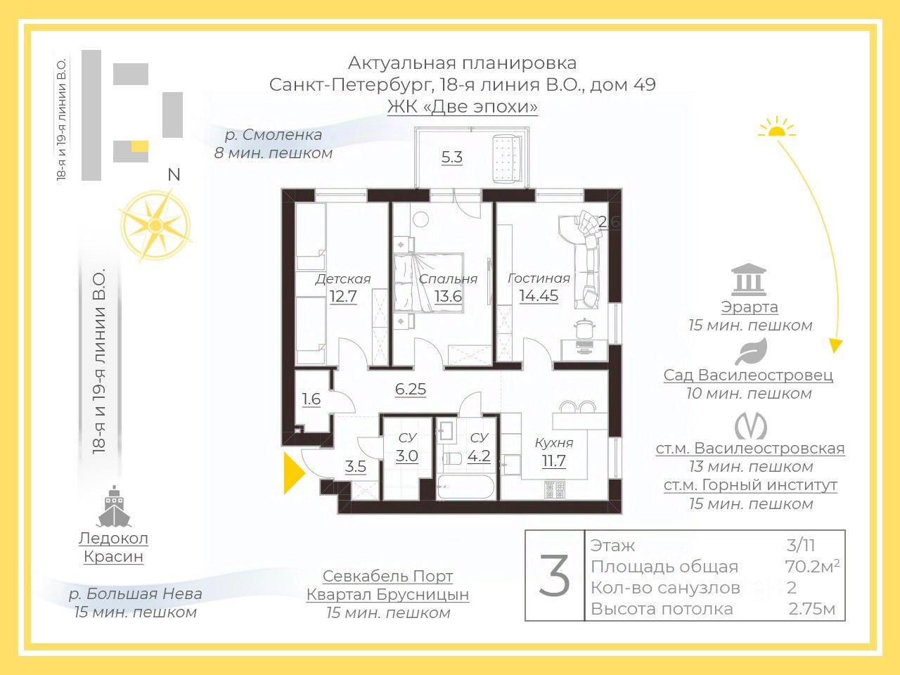 Развитая инфраструктура Васильевского острова: рядом школы, детские сады, университеты, магазины, кафе, салоны красоты и знаковые достопримечательности. Удобная транспортная доступность: 15 минут пешком до станций метро "Василеостровская" и "Горный институт", рядом выезд на ЗСД.