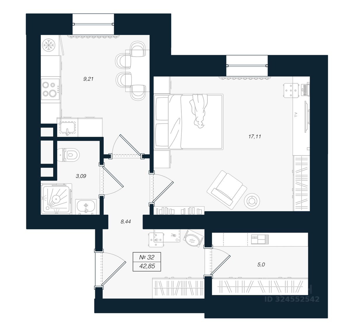 Просторная однокомнатная квартира - 42,85 м2 с большой гардеробной.