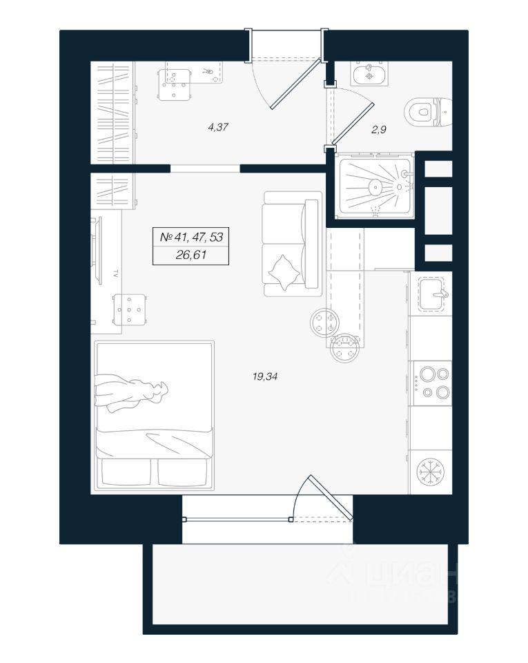 Просторная студия с удобной планировкой - 24,62 м2 и балконом в жк "Феникс Рощино".