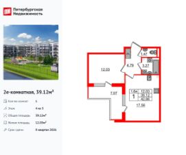 Удобная, классическая, функциональная европланировка, большая кухня-гостиная 17.56 м², просторная прихожая 4.79 м². Общая площадь квартиры - 39.12 м², жилая 12.03 м², высота потолка 2.77 м.