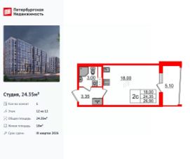 Удобная, классическая, функциональная европланировка, просторная прихожая 3.35 м². Общая площадь студии - 24.35 м², жилая 18 м², высота потолка 3 м.