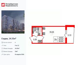 Удобная, классическая, функциональная европланировка, просторная прихожая 3.35 м². Общая площадь студии - 24.35 м², жилая 18 м², высота потолка 2.77 м.