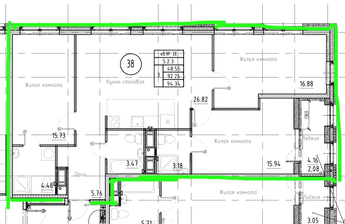 Площадь квартиры 94,3м, объединив лоджию с комнатой прибавится почти 5 метров полезной площади! Итого: 98,2 метра!