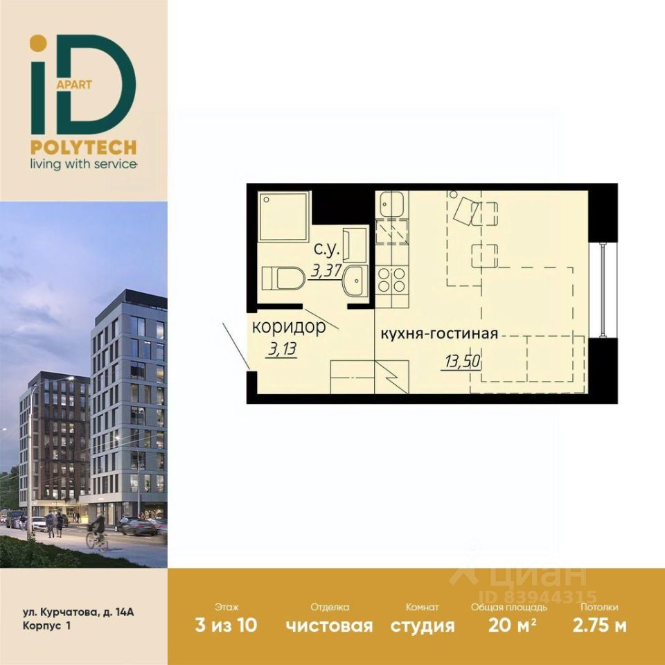 В продаже стильная эргономичная студия с готовой отделкой в эксклюзивном апарт-комплексе iD Polytech.