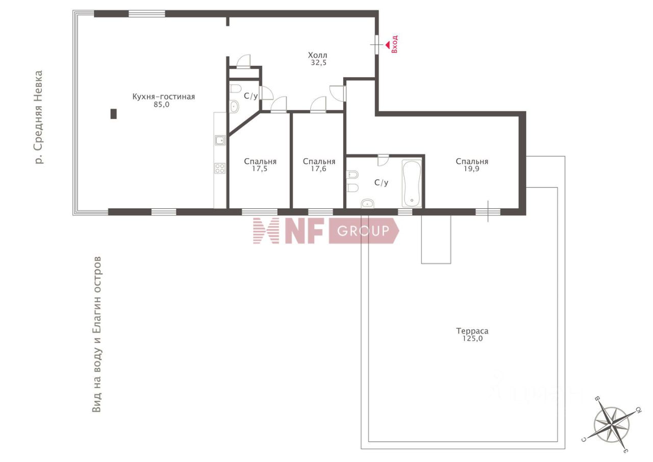 Солнечная терраса и панорамный вид на воду из гостиной-кухни в 85 кв.м, 3 отдельные спальни.