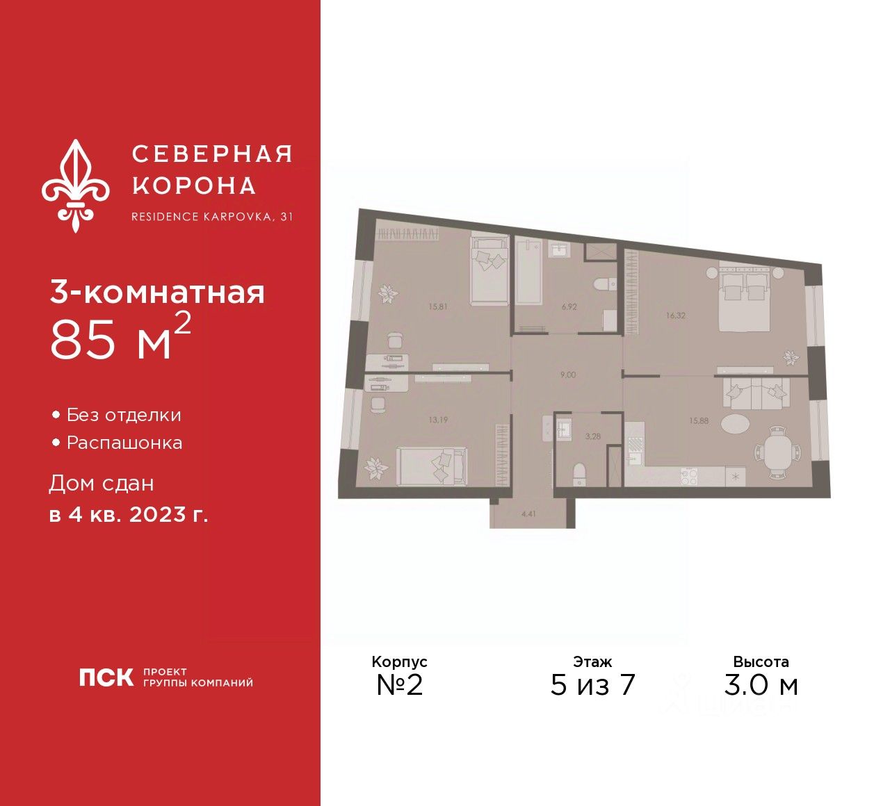 Продается 3-комн. квартира в ЖК "Северная корона" на 5 этаже. Квартира без отделки, после выдачи ключей можно делать ремонт. Общая площадь: 85 кв.м., жилая: 45.32 кв.м., площадь просторной кухни-столовой: 15.88 кв.м. Квартира - распашонка, без проходных комнат, окна выходят на paзные стороны дома. В квартире один балкон, один совмещенный и один раздельный санузел. Высота потолков 3.0 м.