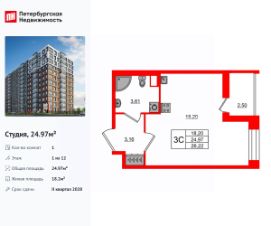 Удобная, классическая, функциональная европланировка, вместительная прихожая 3.16 м². Общая площадь студии - 24.97 м², жилая 18.2 м², высота потолка 2.77 м.