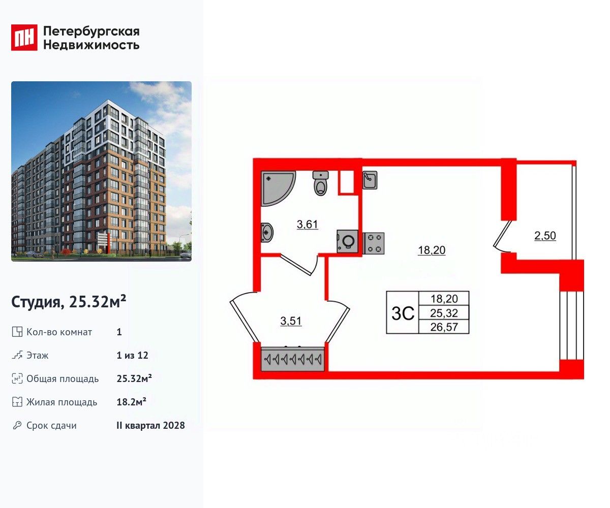 Удобная, классическая, функциональная европланировка, просторная прихожая 3.51 м². Общая площадь студии - 25.32 м², жилая 18.2 м², высота потолка 2.77 м.