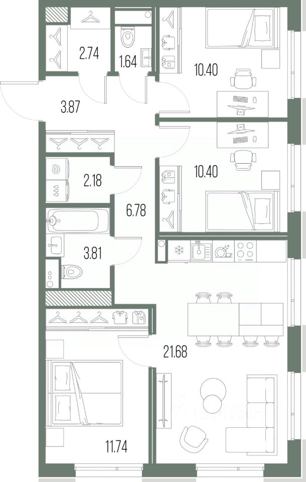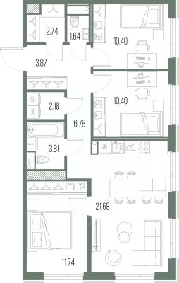 3-комн. квартира с предчистовой отделкой в ЖК "LEGENDA Васильевского" на 2 этаже. Общая площадь: 75.24 кв.м., жилая: 32.54 кв.м., площадь просторной кухни-столовой: 21.68 кв.м. Угловая квартира, очень светлая, естественная вентиляция при открытии окон. В квартире один совмещенный и один раздельный санузел. Высота потолков 2.72 м.
