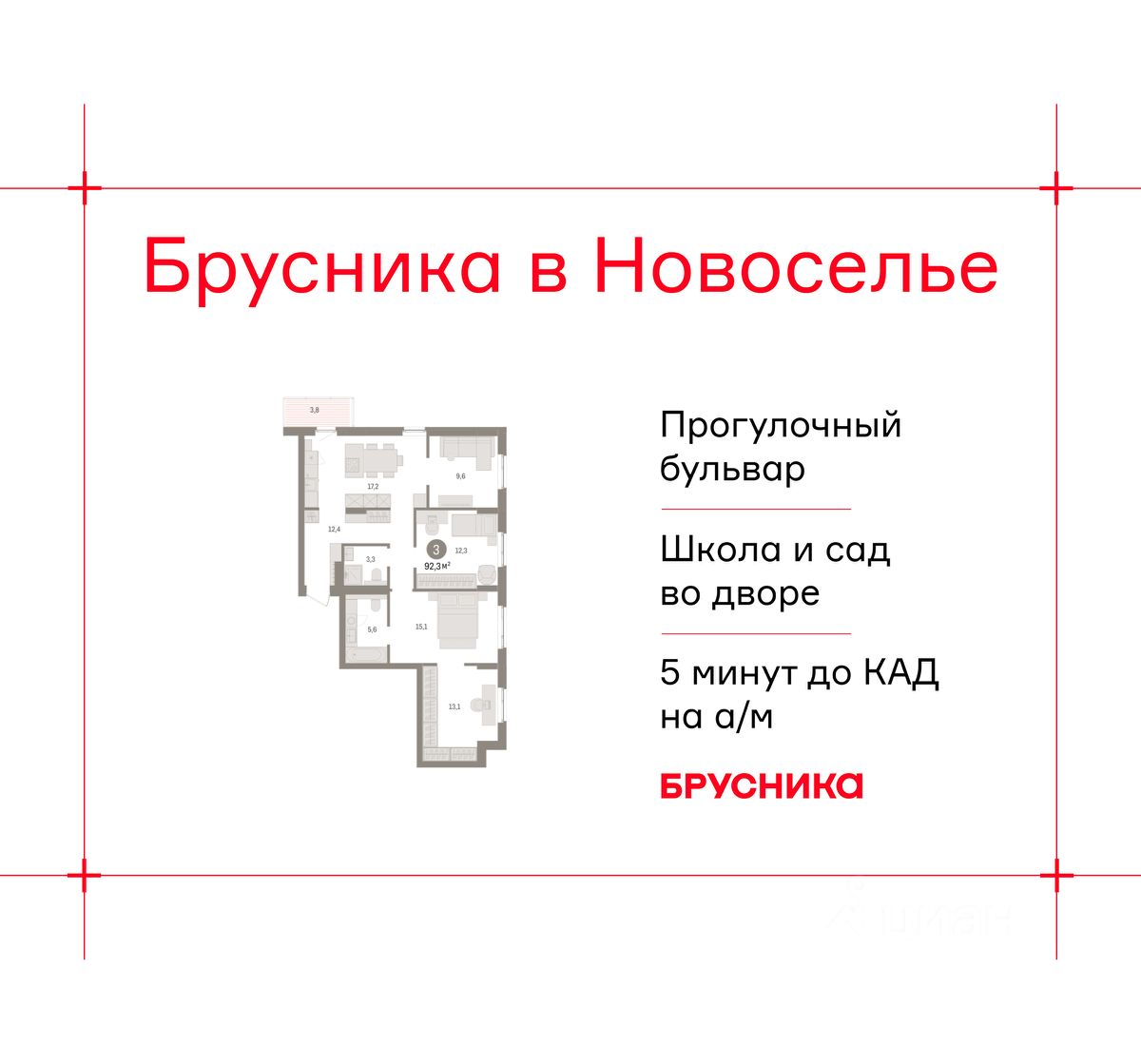 2-комн. квартира от застройщика с предчистовой отделкой в ЖК "Брусника в Новоселье" на 9 этаже. Общая площадь: 92.33 кв.м., жилая: 22.7 кв.м., площадь просторной кухни-столовой: 17.2 кв.м. Квартира угловая, очень светлая, естественная вентиляция при открытии окон. В квартире один балкон, два совмещенных санузла. Высота потолков 2.7 м.
