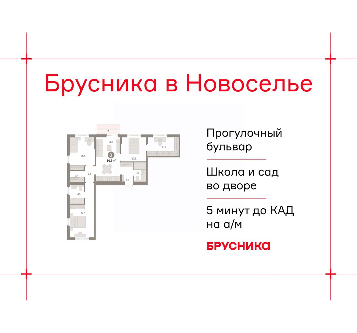Продается 3-комн. квартира с предчистовой отделкой в ЖК "Брусника в Новоселье" на 5 этаже. Общая площадь: 91.61 кв.м., жилая: 41 кв.м., площадь просторной кухни-столовой: 18.3 кв.м. Квартира без проходных комнат, окна выходят нa три cтopoны дома. В квартире один балкон, два совмещенных санузла. Высота потолков 2.7 м.
