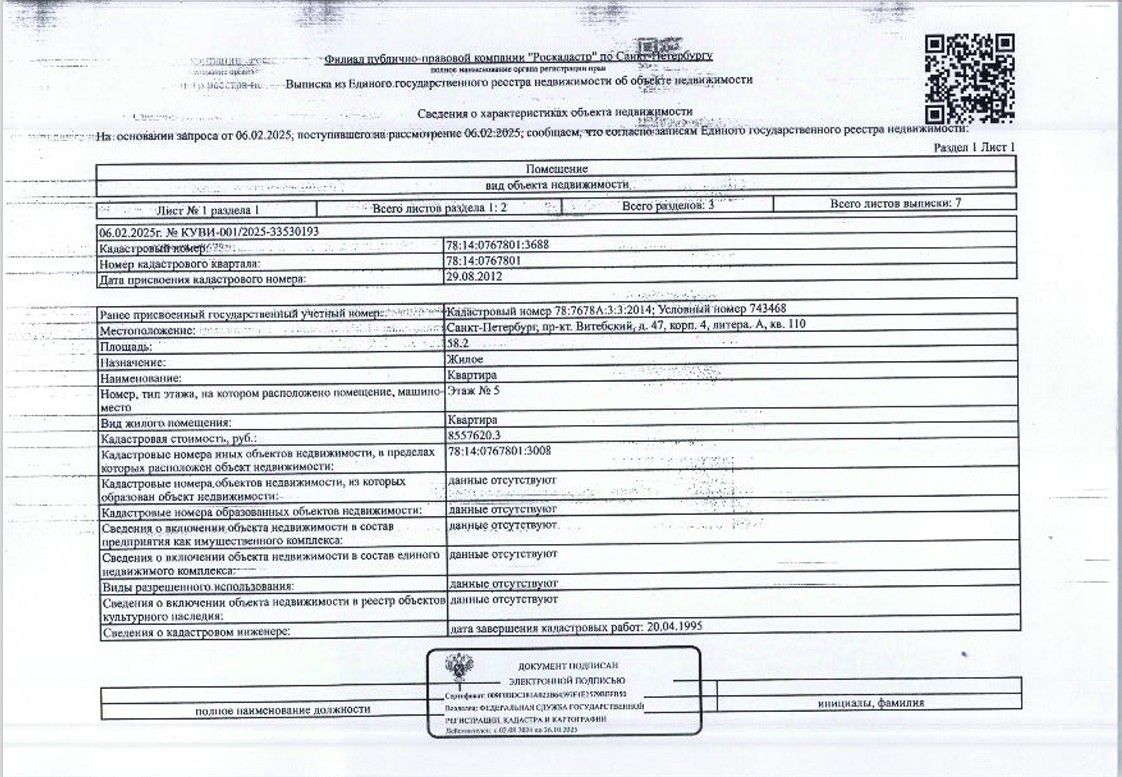 квартира по адресу: г. Санкт-Петербург, Витебский пр., д.47, корп.4, лит. А, кв.110, общ. пл. 58.2 кв.м., кадастровый номер 78:14:0767801:3688
