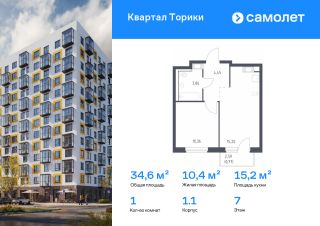 Строим кварталы для жизни с заботой о будущем. Предлагается 1-комнатная квартира комфорт-класса 34,64 кв.м в корпусе 1.1 на 7 этаже, в ЖК "Квартал Торики"