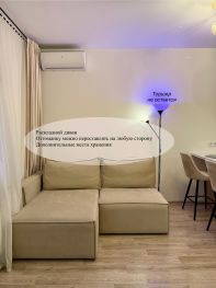 • За диваном полка - со встроенными розетками (удобно зарядить телефон или включить гирлянду);