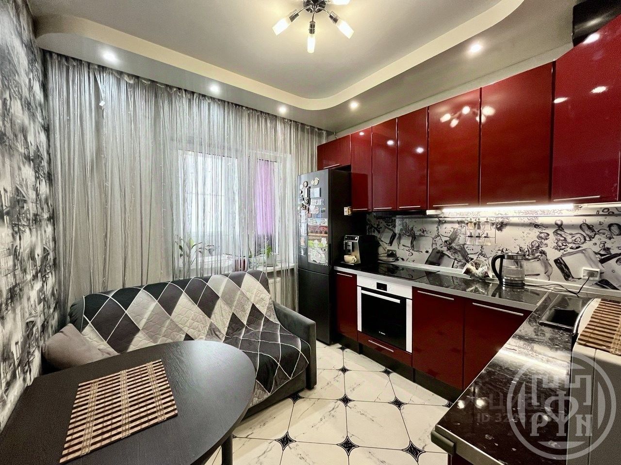 Светлая большая кухня со стильным кухонным гарнитуром, на которой Вы с удовольствием будете собираться всей семьёй и с друзьями.