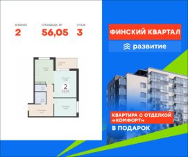 Продается квартира площадью 56.05 кв. м с отделкой white box. Квартира расположена на 3 этаже 8 этажного дома, в жилом комплексе комфорт-класса "Финский Квартал".