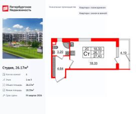 Уникальная, функциональная европланировка, просторная прихожая 4.64 м². Общая площадь студии - 26.17 м², жилая 18.33 м², высота потолка 2.77 м.