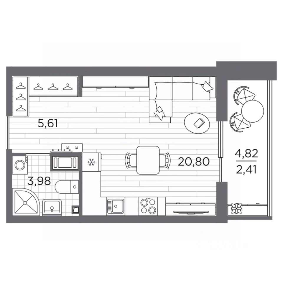Просторная 1-комн. квартира-студия с предчистовой отделкой в ЖК "RESPECT" на 10 этаже. Общая площадь: 32.8 кв.м., площадь гостиной 20.8 кв.м., из которых 5 кв.м. выделено под кухонную зону. Все окна выходят на одну сторону. В квартире один балкон, один совмещенный санузел. Высота потолков 2.7 м.