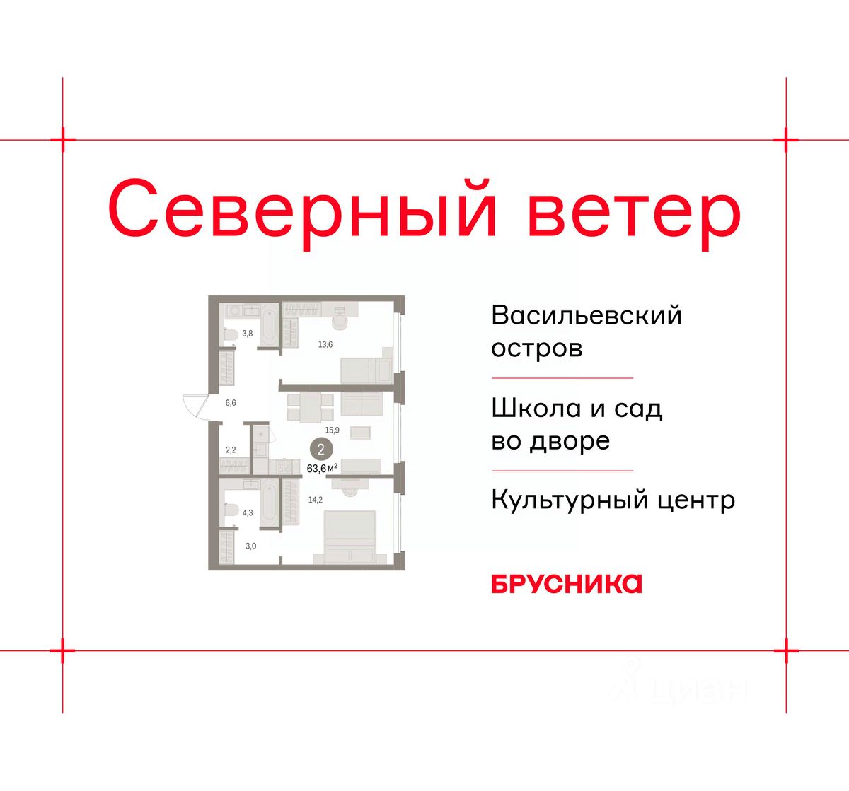 Продается 2-комн. квартира с предчистовой отделкой в ЖК "Северный ветер" на 5 этаже. Общая площадь: 63.65 кв.м., жилая: 27.8 кв.м., площадь просторной кухни-столовой: 15.9 кв.м. Комнаты изолированные, все окна выходят на одну сторону. В квартире два совмещенных санузла. Высота потолков 2.98 м.