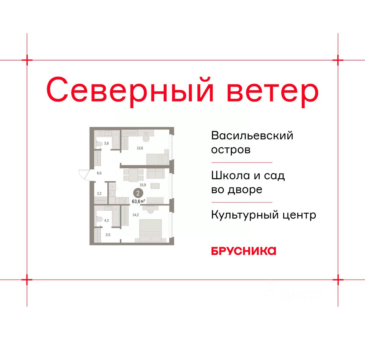 Продается 2-комн. квартира с предчистовой отделкой в ЖК "Северный ветер" на 7 этаже. Общая площадь: 63.65 кв.м., жилая: 27.8 кв.м., площадь просторной кухни-столовой: 15.9 кв.м. Комнаты изолированные, все окна выходят на одну сторону. В квартире два совмещенных санузла. Высота потолков 2.98 м.