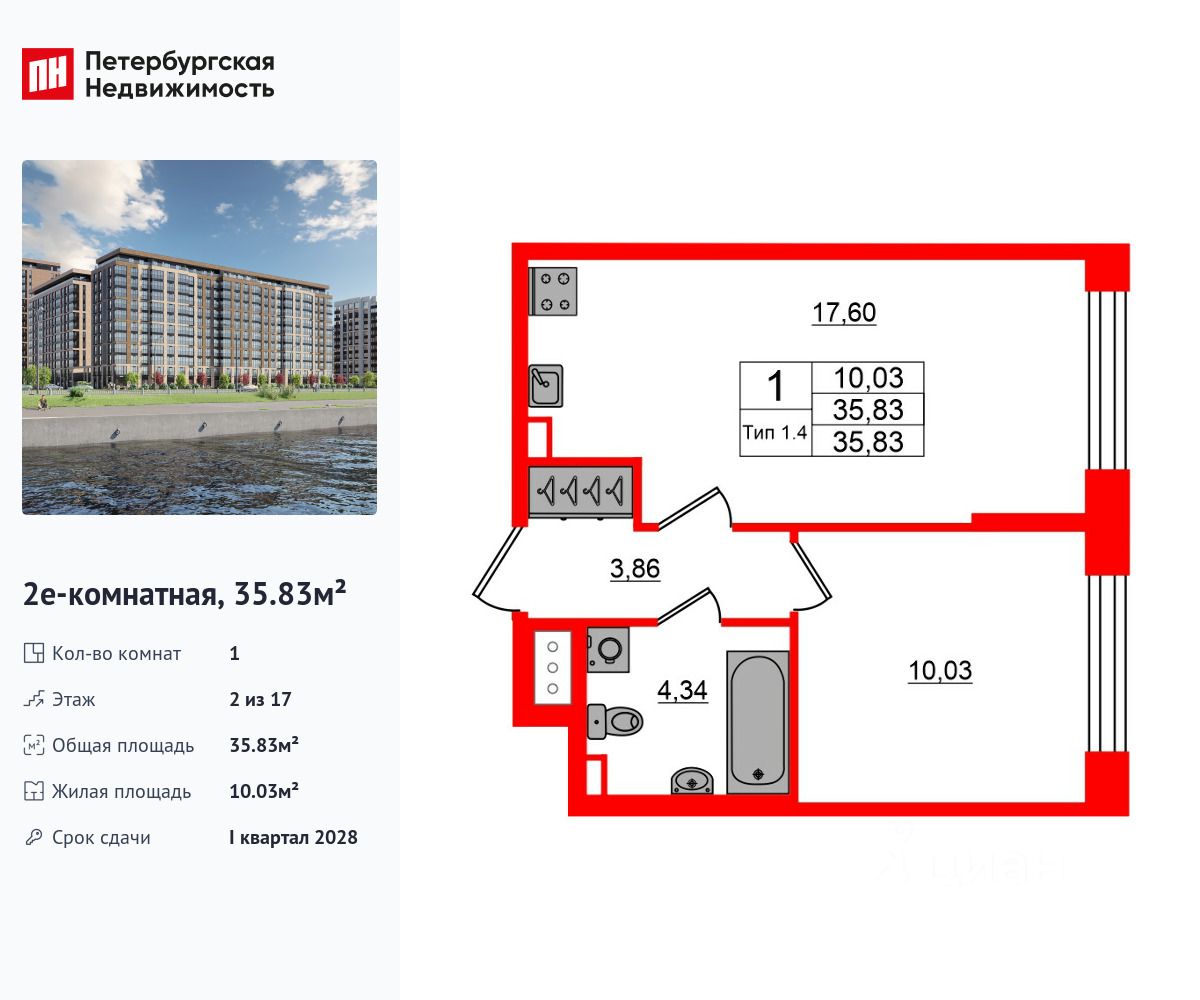 Удобная, классическая, функциональная европланировка, большая кухня-гостиная 17.6 м², вместительная прихожая 3.86 м². Общая площадь квартиры - 35.83 м², жилая 10.03 м², высота потолка 2.77 м.