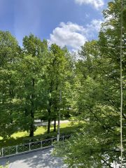 Дом расположен на перекрестке Петергофского шоссе и Фронтовой улицы. Окна выходят на парк. Вокруг очень много зелени.