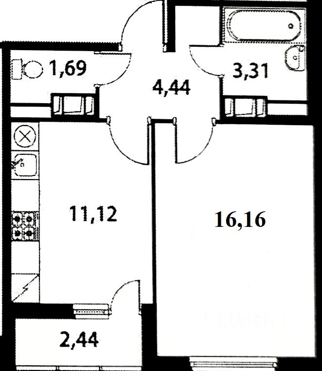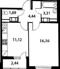 Жилая площадь составляет 16,16 квадратных метров, кухня занимает 11.2 квадратных метра, лоджия 3,5 квадратных метра с видом в тихий двор.