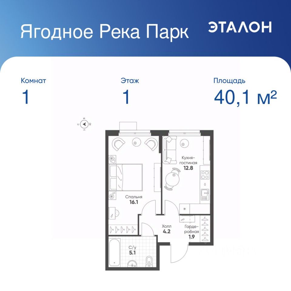 Продается 1-к квартира без отделки в ЖК "Ягодное Река Парк".