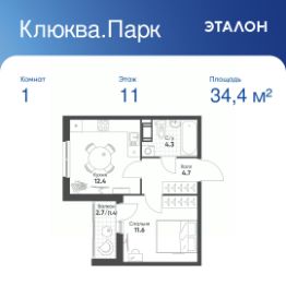 Общая площадь квартиры — 34.4 кв. м, этаж 11 из 12.
