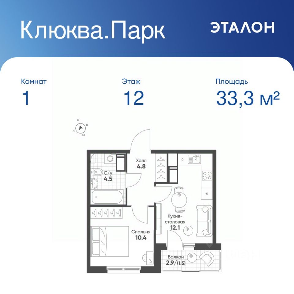 Общая площадь квартиры — 33.3 кв. м, этаж 12 из 12.