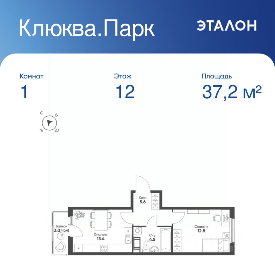 Общая площадь квартиры — 37.2 кв. м, этаж 12 из 12.