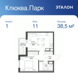 Общая площадь квартиры — 38.5 кв. м, этаж 11 из 12.