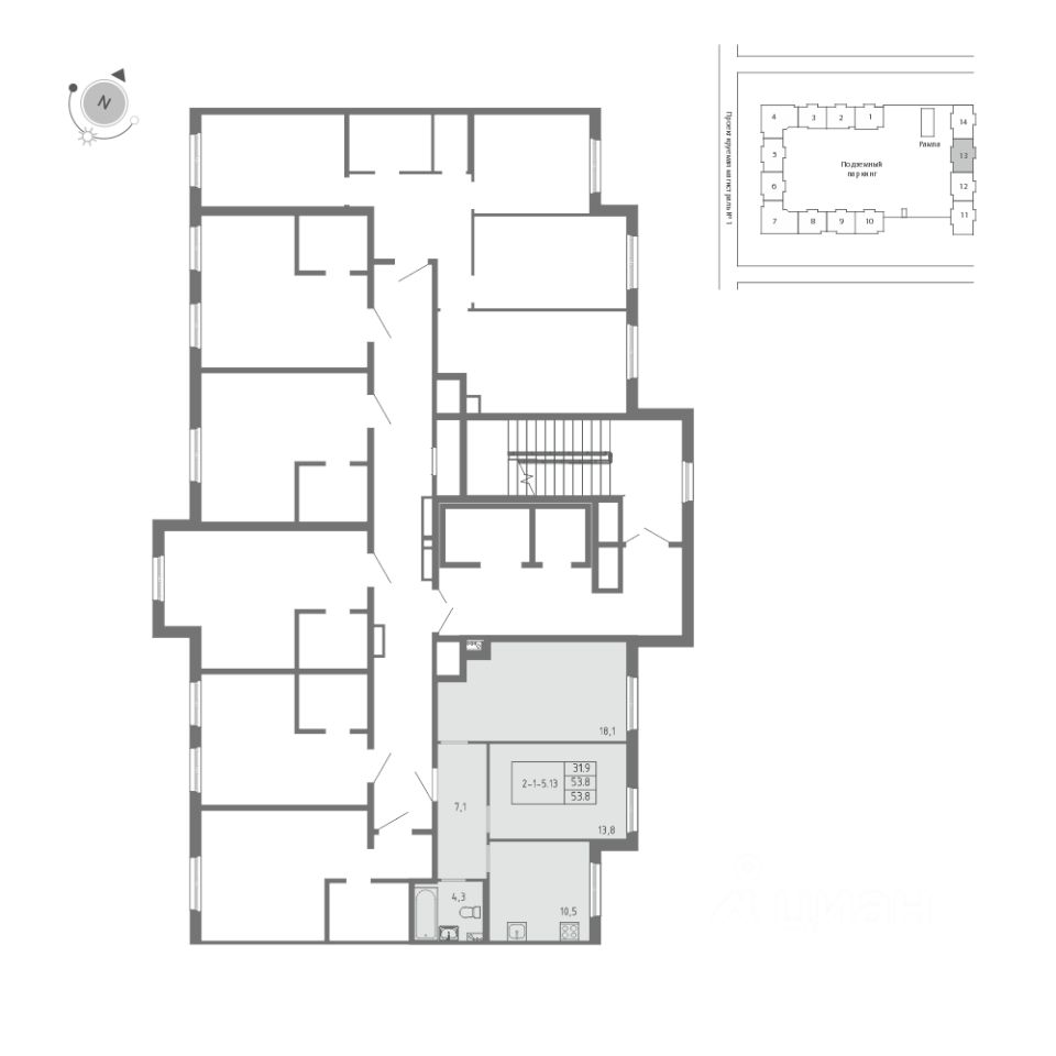 Общая площадь квартиры — 53.8 кв. м, этаж 2 из 12.