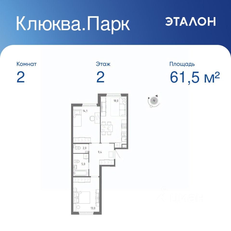 Общая площадь квартиры — 61.5 кв. м, этаж 2 из 12.