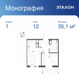 Общая площадь квартиры — 35.1 кв. м, этаж 12 из 12.