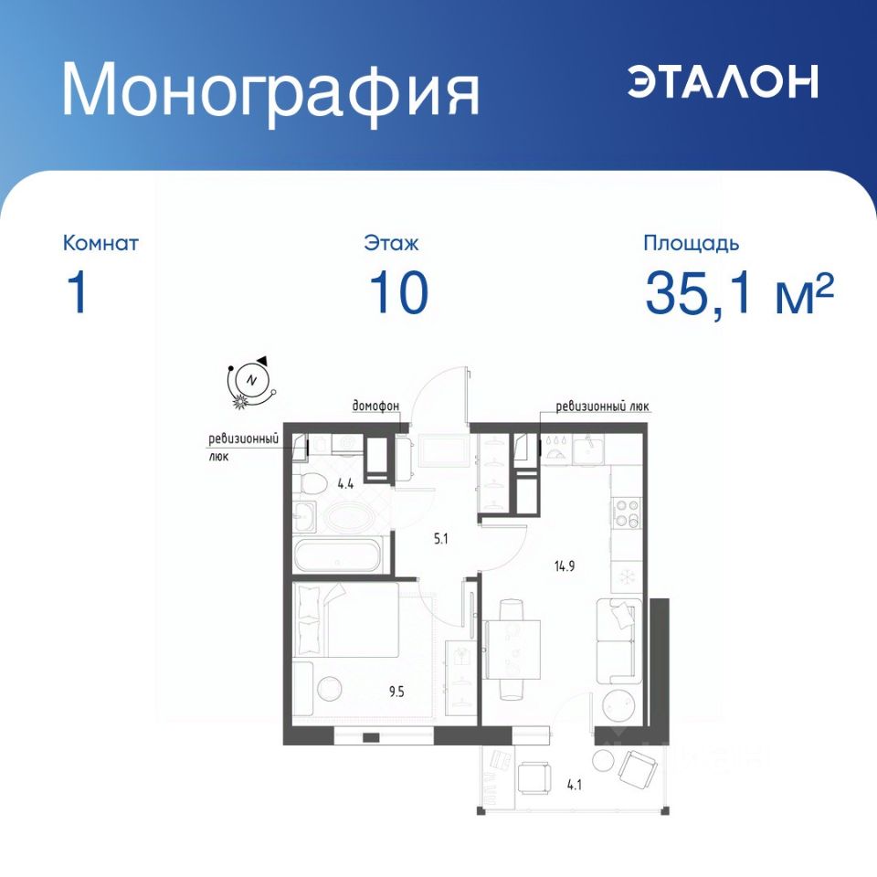 Общая площадь квартиры — 35.1 кв. м, этаж 10 из 12.