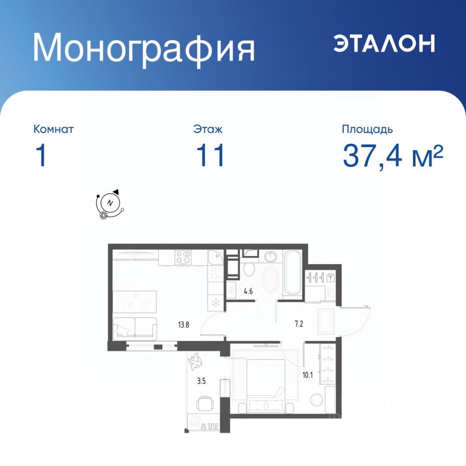 Общая площадь квартиры — 37.4 кв. м, этаж 11 из 12.