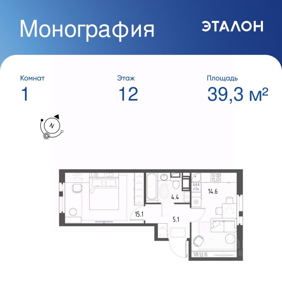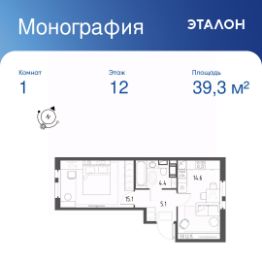Общая площадь квартиры — 39.3 кв. м, этаж 12 из 12.