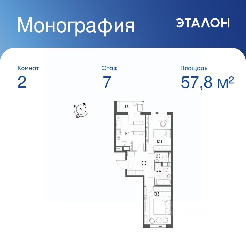 Общая площадь квартиры — 57.8 кв. м, этаж 7 из 12.