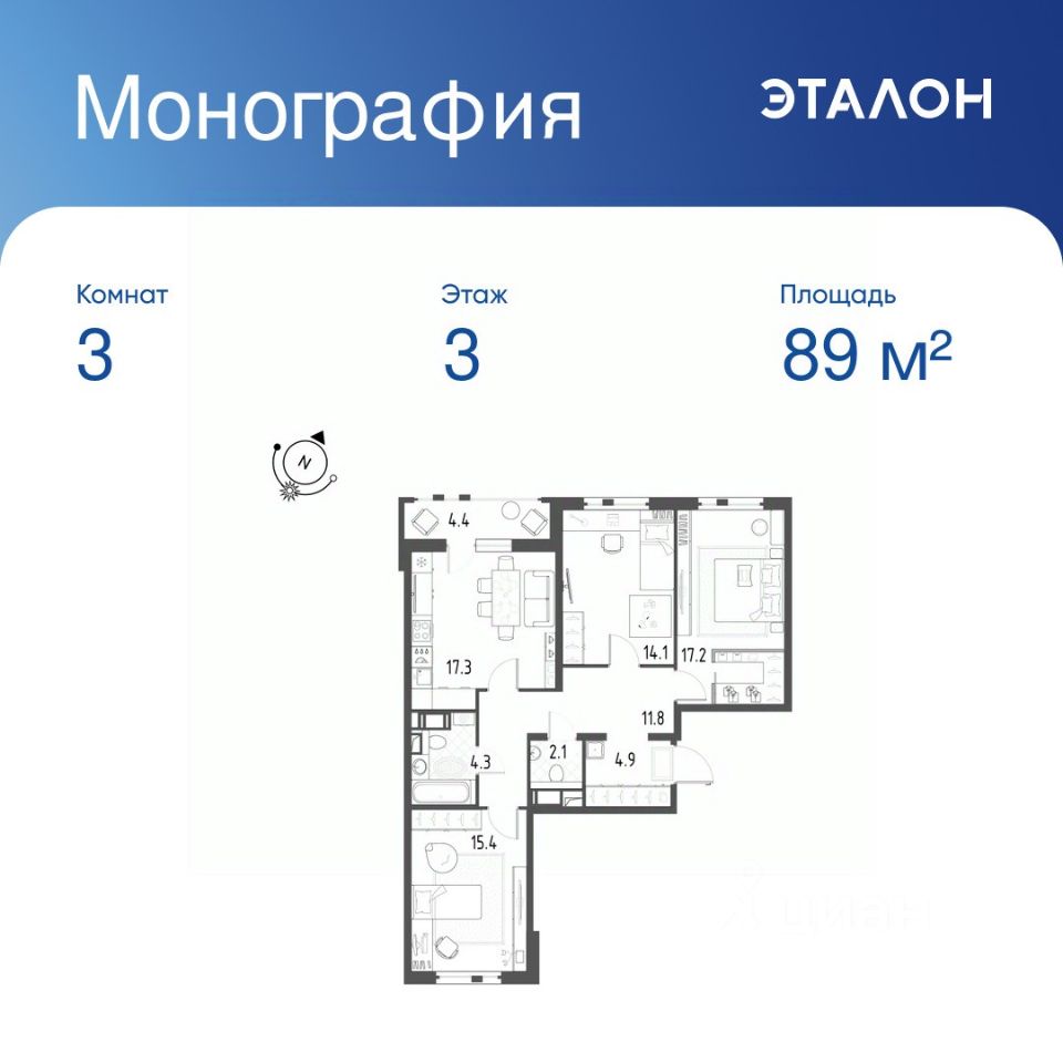 Общая площадь квартиры — 89 кв. м, этаж 3 из 12.