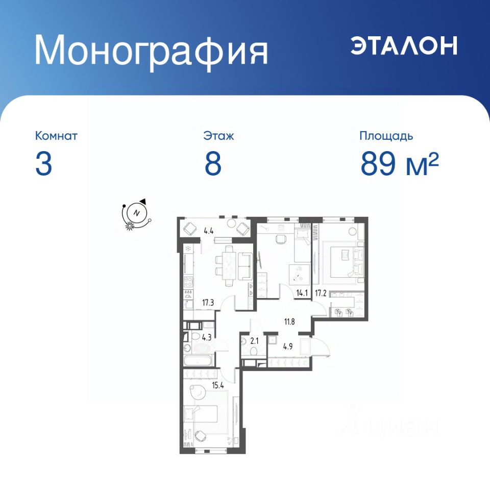 Общая площадь квартиры — 89 кв. м, этаж 8 из 12.
