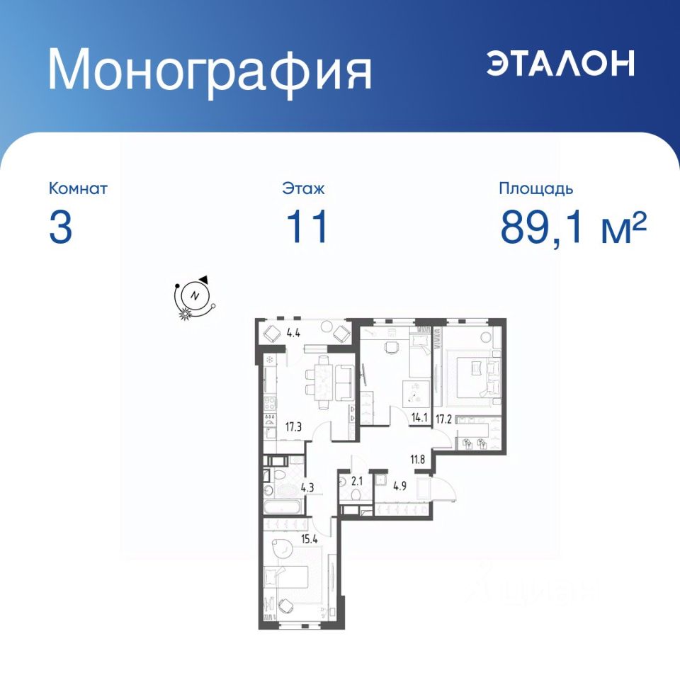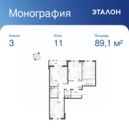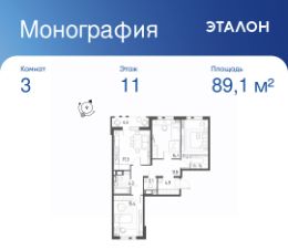Общая площадь квартиры — 89.1 кв. м, этаж 11 из 12.