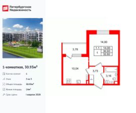 Удобная, классическая планировка, кухня 10.04 м², вместительная прихожая 3.73 м². Общая площадь квартиры - 30.93 м², жилая 14 м², высота потолка 3.07 м.